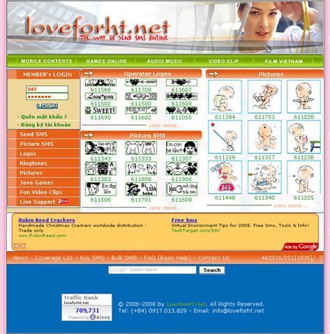 Đầu tiên bạn hẫ truy cập vào http://loveforht.net Giao diện trang web rất dễ sử dụng đặc biệt là hoàn, đăng ký làm thành viên mỗi ngày sẽ được gửi 3 tin nhắn SMS miễn phí , hạn chế của trang web này là chỉ sử dụng cho Mobiphone , Viettel và Vinaphone và chỉ sdùng được với những số điện thoại bắt đầu là 09xxxxxxxx mà thôi, nếu muốn gửi được những tin nhắn hình phaỉ phaỉ trả tiền . Hãy thử sử dụng , giao diện hoàn toàn bằng tiếng Việt , người Việt dùng hàng Việt .